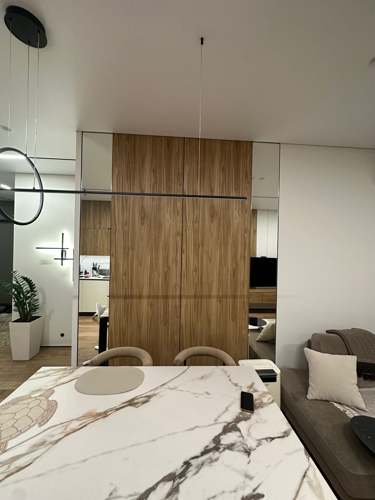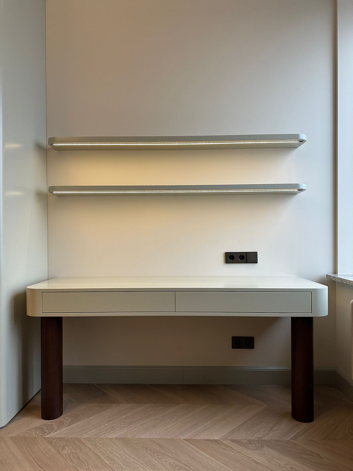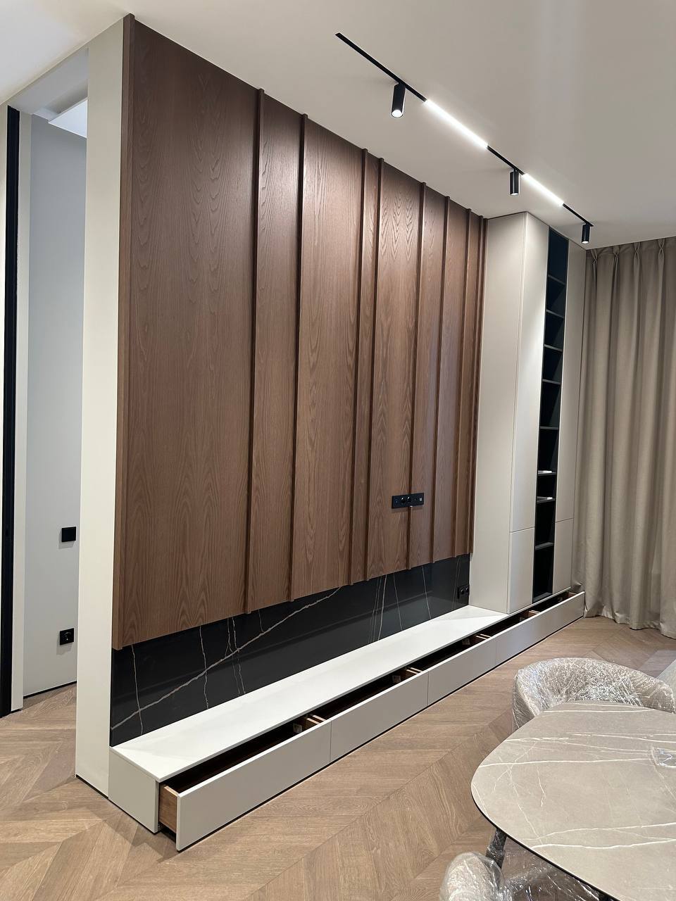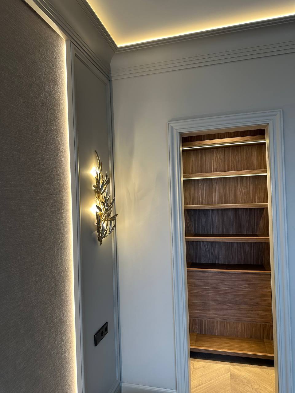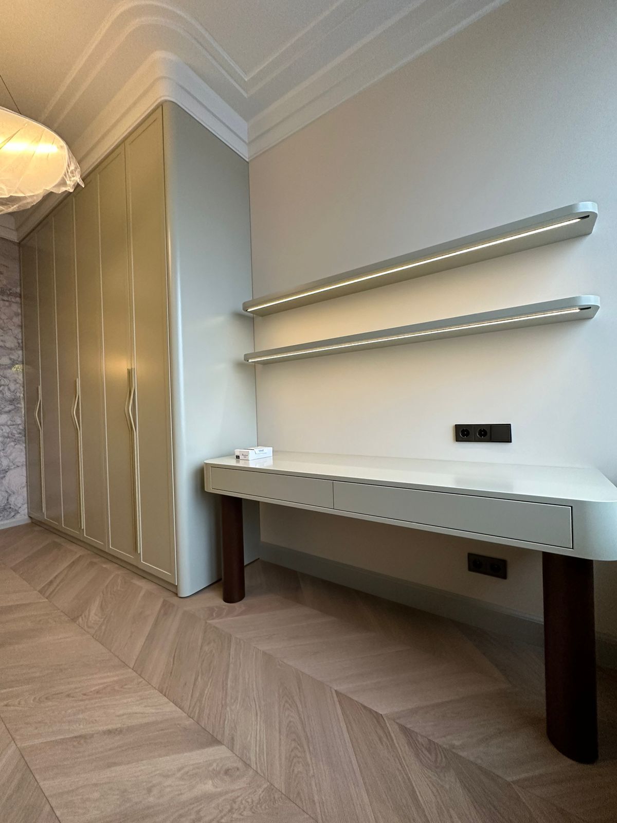Проект мебелеровки квартиры под ключ представляет собой символ современной жизни и комфорта. Дизайн отличается уникальным стилем минимализма, функциональной планировкой и продуманными решениями для комфортного проживания. Одной из ключевых особенностей этого проекта является использование большого количества доводчиков, которые присутствуют на большинстве изделий и заказчик выбрал Blum фурнитуру для повышенного комфорта при открывании. Наша корпусная мебель идеально вписывается в концепцию минимализма, подчеркивая чистые линии и упрощённые формы, создавая ощущение лёгкости и простора. Вся корпусная мебель выполнена с учётом индивидуальных потребностей и предпочтений владельцев, что обеспечивает высокий уровень комфорта и удовлетворения. Шкаф в гардеробную квартиры также спроектирован с максимальной функциональностью. Интегрированы штанги, вешалки, брючницы, и многое другое. Этот проект является ярким примером современного и функционального подхода к дизайну интерьера, отражая лучшие аспекты комфортного и стильного жилья. Мы гордимся тем, что создали мебель на заказ для этой квартиры, воплотив в жизнь идеалы минимализма и функциональности для максимального комфорта и удовольствия наших клиентов.