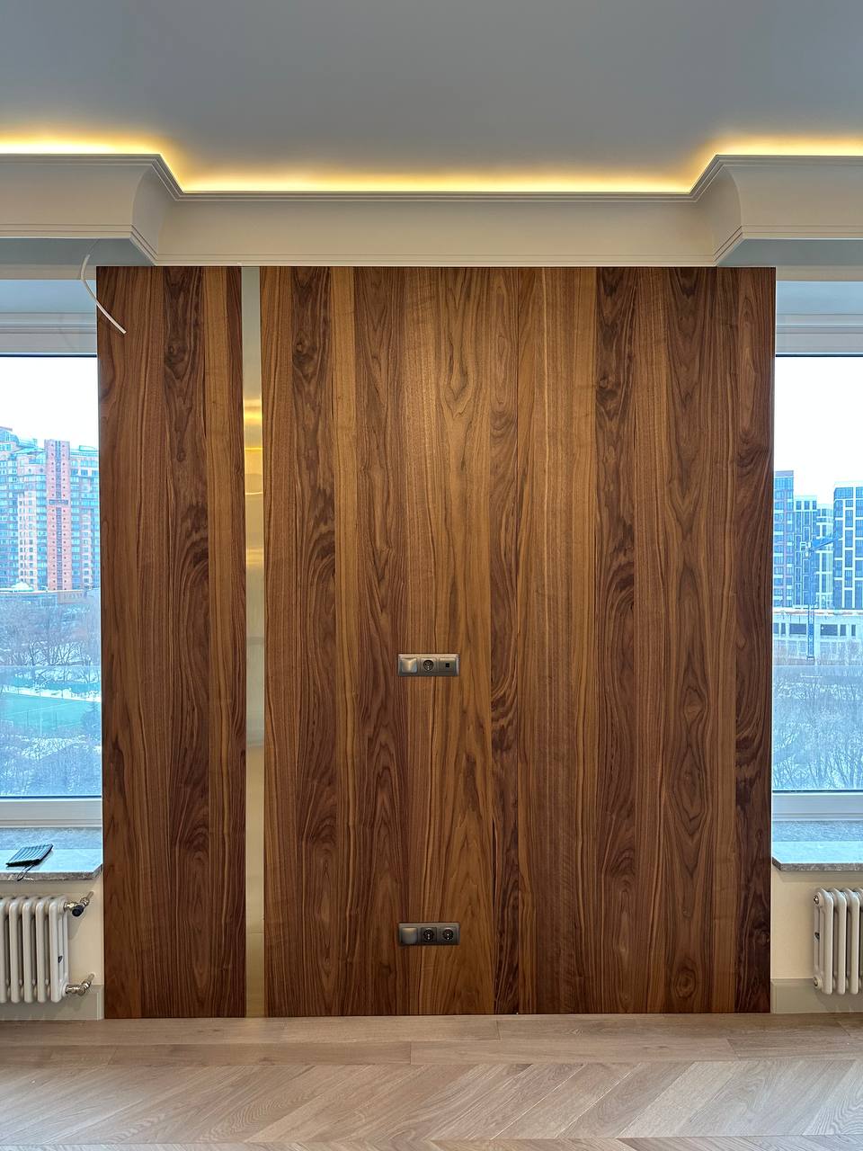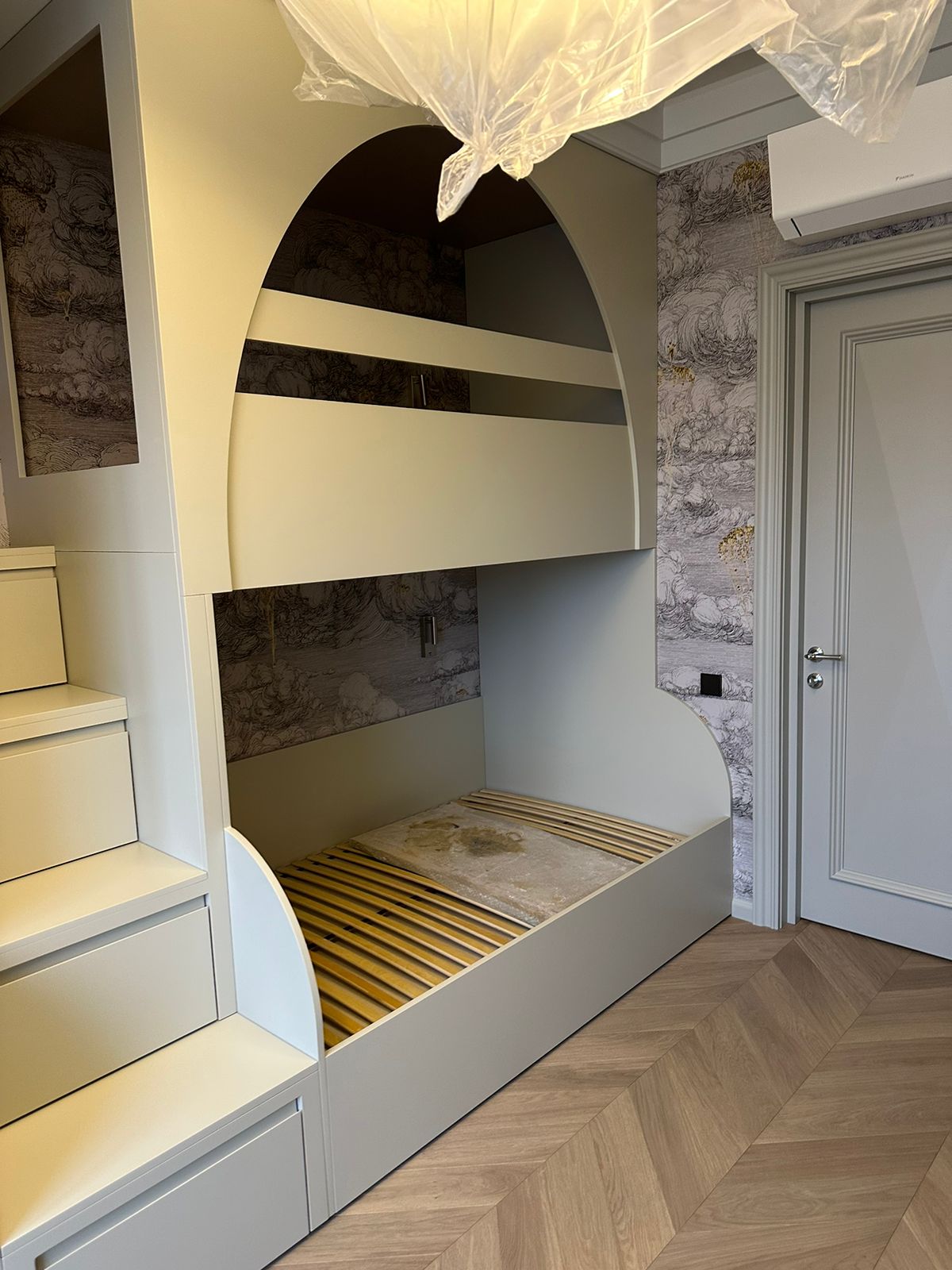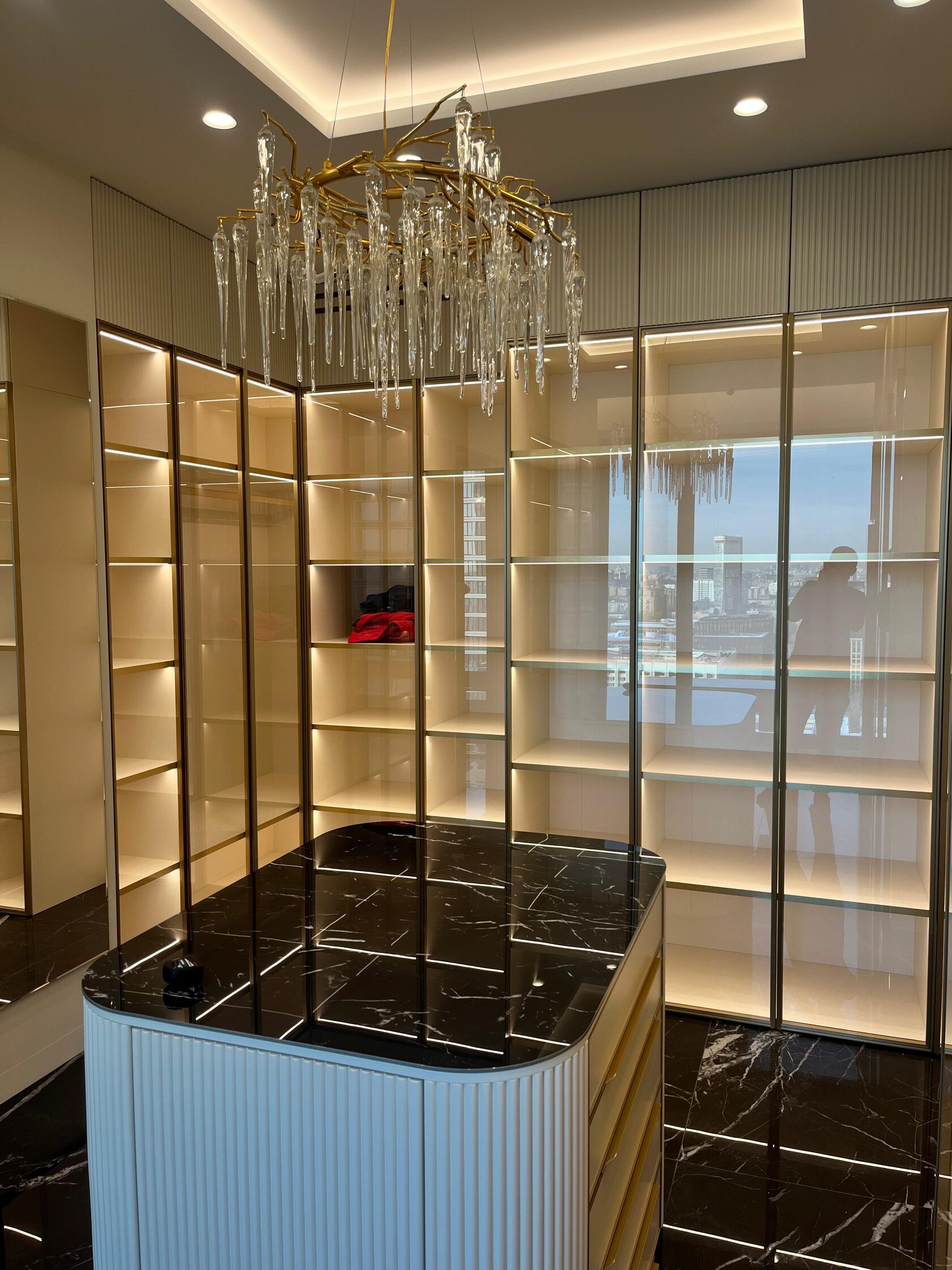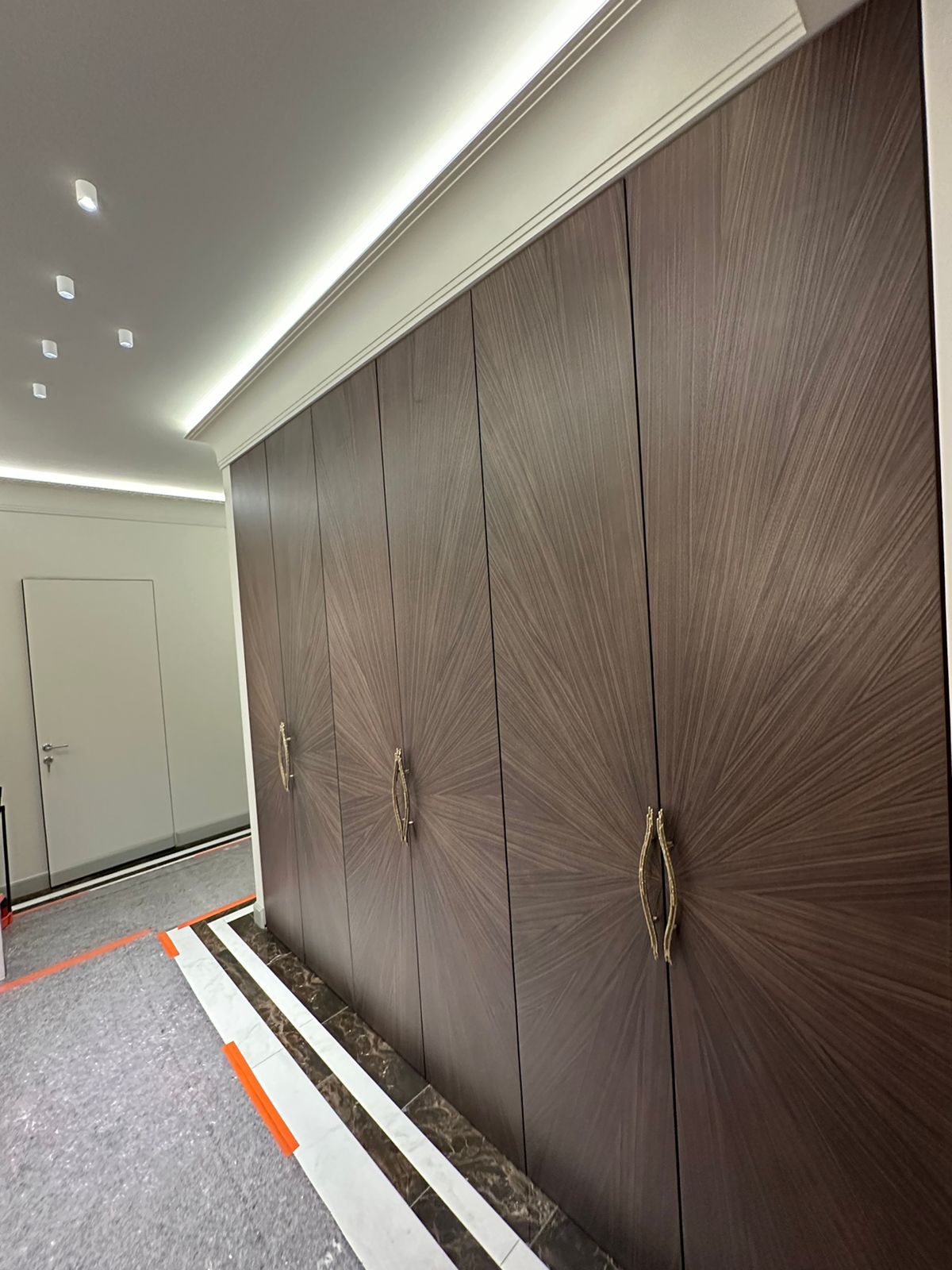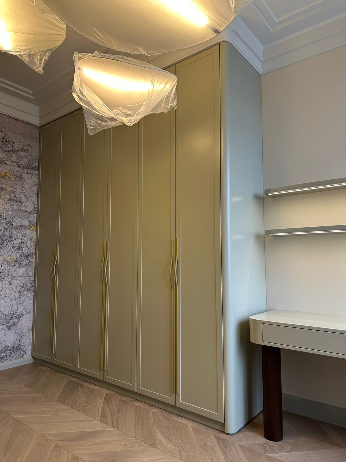 Проект, исполненный в теплых оттенках, в сочетании со стенами и стилистикой всего интерьера. Вся фурнитура в этом проекте от производителя Blum, с доводчиками. Прихожая - вместительный шкаф просторные отделения со штангами, место для обуви, полки, и даже ящики для мелочей, учитывались все расположения щитков и коллектора, корпус австрийский ЛДСП, фасад уникальная работа из мульти шпона, рисунок лучи исходящие от центра. Гостиная - настенные панели выполнены из шпона американского ореха с латунными вставками цвета шампань. Детская – Шкаф для четверых детей в не большом пространстве достаточно вместительный, предусмотрены и полки и ящики для мелочей и штанги для вешалок и даже брючницы, все продумано с доступом для самих детей. Бок шкафа в радиусном исполнении покрытие эмаль, корпус ЛДСП Австрия, фасады МДФ эмаль Renner (Италия)в благородном цвете. Стол так же с радиусными деталями МДФ покрытие эмаль, ножки стола массивные МДФ покрытие шпон. Над столом полки со встроенной подсветкой и сенсорным датчиком. Кровать очень прочная, в основе ее металлический каркас, обшита ЛДСП Австрия, с арочными элементами из МДФ эмаль. В ступенях встроены ящики с интегрированными ручками. Постирочная – выполнена из ЛДСП Австрия, не большая, но очень вместительная, столешница HPL Австрия. Гардеробные – их тут две. Стильные, все будто парит в воздухе. Это благодаря крепкому металлическому каркасу, обшитый ЛДСП Австрия утолщенные детали, ящики полного выдвижения, штанги с верхним креплением и встроенная подсветка.