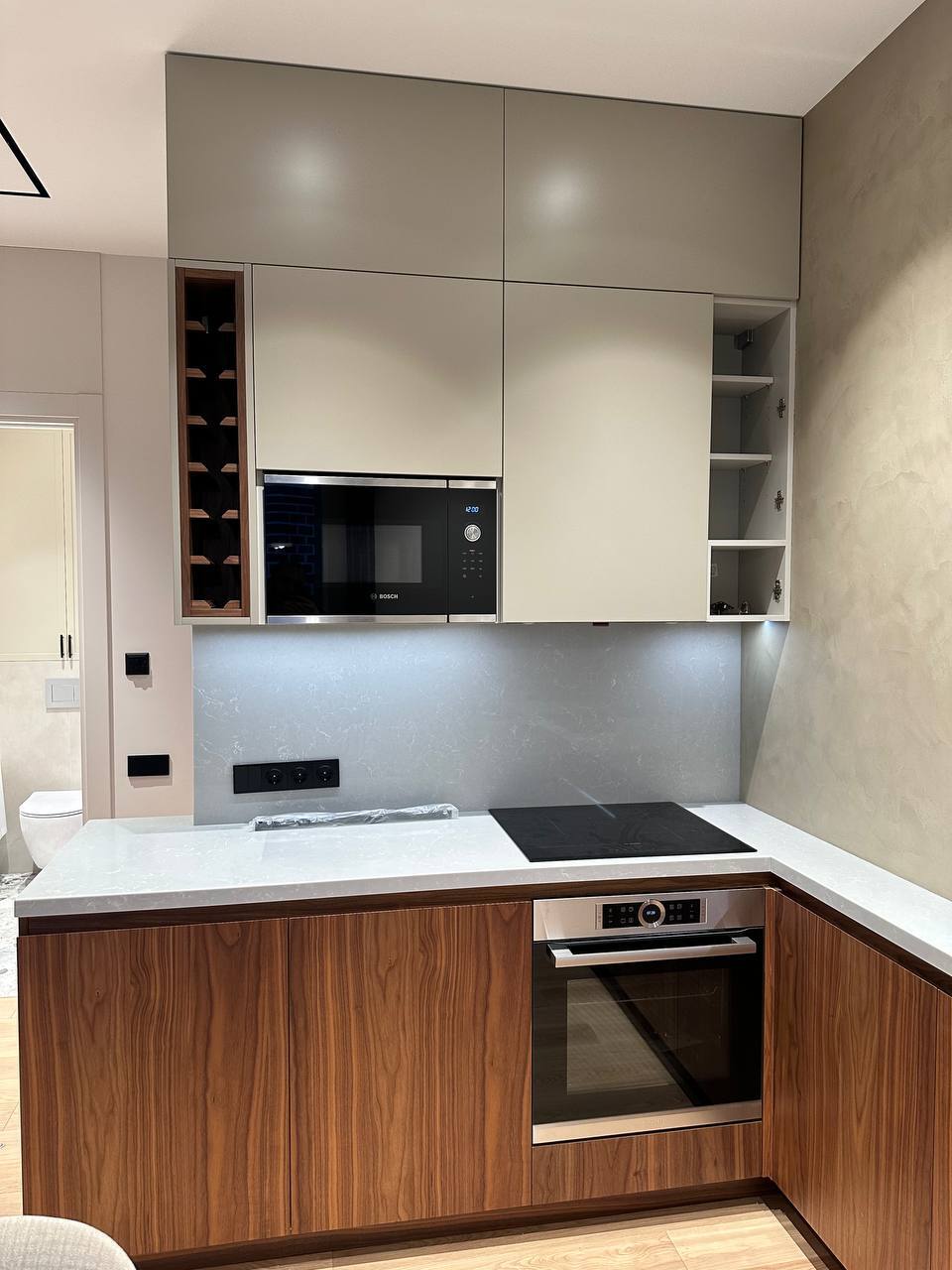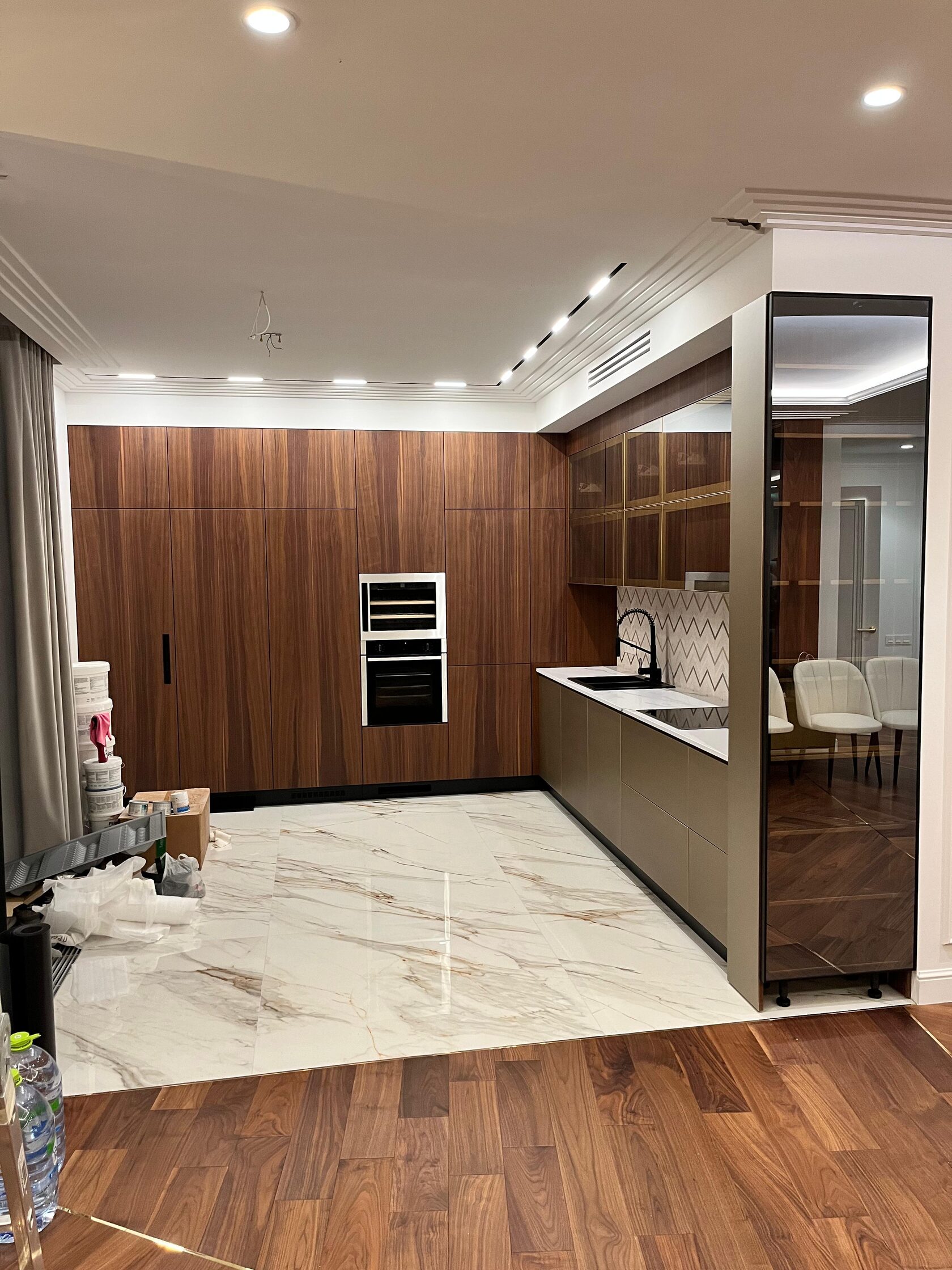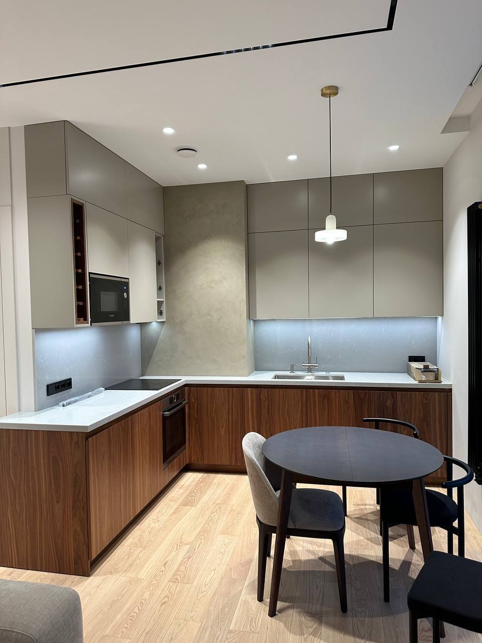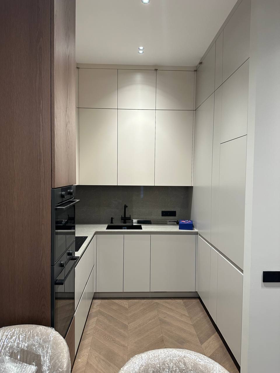 Монтаж всей мебели, встроенной бытовой техники, подключение подсветки предусмотренной в мебели выполнены нашей компанией.